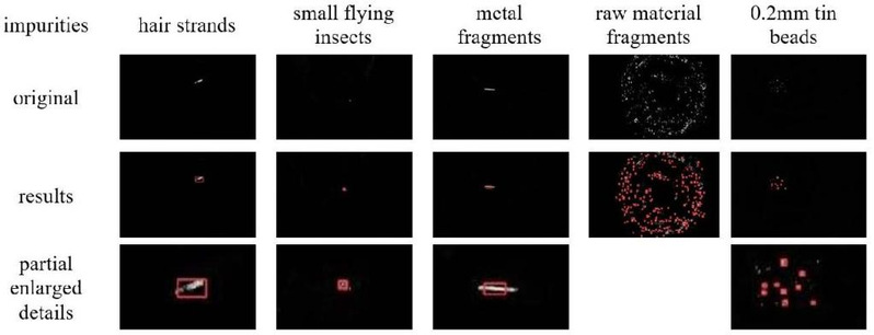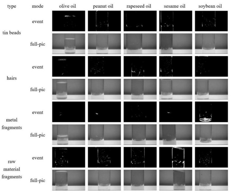 食用油在生产制造过程中会混入原料碎片、毛发、金属碎片等微小固体杂质。根据国内外植物油标准,食用油中不溶性杂质含量不得超过0.05%,因此食用油生产企业在销售前都会进行杂质检测。然而,此类杂质尺度通常在亚毫米级,且常存在气泡、反光等因素干扰,人眼无法识别。对传统机器视觉方法来说,液体中弱小目标的检测识别一直是技术难题。基于深度学习的视觉检测方法提高了检测的效率和实用性,但缺乏综合可用的食用油固体杂质数据集。本研究采用动态视觉传感器,建立并公开了一个双模态食用油杂质数据集DMEOI,填补了现有空白。该数据集由14520张事件和可见光双模态图像组成,采用两种方式进行标注,包含5种常见食用油和4种典型杂质,可用于单模态或双模态油液杂质检测。SSD、RetinaNet、YOLOv5和YOLOv7四种典型目标检测算法均验证了数据集的有效性。