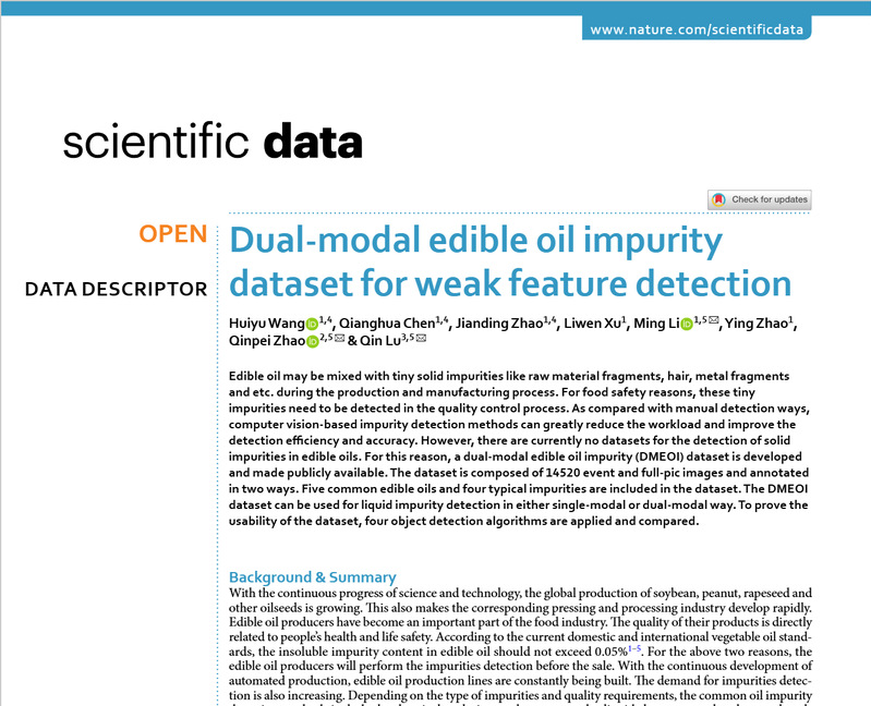 近日,402永利集团智能视觉团队黎明、赵莹老师在Nature旗下Scientific Data子刊发表题为“Dual-modal edible oil impurity dataset for weak feature detection”的研究论文。该期刊专注于数据集以及促进科学数据共享和再利用的研究,SCI Q1期刊,五年影响因子8.9。本成果以402永利集团为第一单位,由402永利集团黎明老师(通讯作者)、赵莹老师与同济大学、上海交通大学医公司共同完成,公司2022级电气工程硕士生王彗瑜和陈强华、2023级电子信息硕士生赵建鼎共同一作。