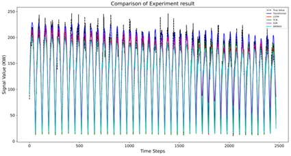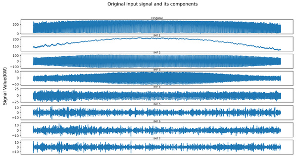 由于光伏输出信号呈现复杂非平稳特征,信号预处理与关键特征提取已成为提升预测性能的核心研究问题。在此背景下,变分模态分解(Variational Mode Decomposition,VMD)通过自适应频域分解实现多尺度频率分量的稳定分离,将非平稳信号解析为若干带宽受限的固有模态函数(Intrinsic Mode Functions,IMFs)。尽管VMD凭借其抗模态混叠特性已成为光伏信号分析的主流方法,但现有研究对IMFs的利用仍存在以下关键局限:IMF本质是数学构造量而非物理可观测变量,无法直接作为预测模型的输入特征;现有基于IMF分量独立预测后叠加的方法,由于缺乏相关性较高的外部特征,导致高频分量的预测存在显著偏差。针对上述问题,本研究提出一种基于关键IMFs特征构造的光伏预测方法。首先,采用小波阈值降噪(Wavelet Threshold Denoising,WTD)对原始光伏功率数据进行处理;随后通过VMD分解获取信号IMFs分量,并根据影响性分析和初步预测实验结果,评估筛选出关键IMFs,通过模型预测生成IMFs特征;最后将预测得到的IMFs特征与天气特征共同作为输入,用于光伏发电量预测。实验表明,引入IMF特征后,五种模型的MAE和SMAPE分别平均降低12.68%和17.65%,模型预测性能显著增强。