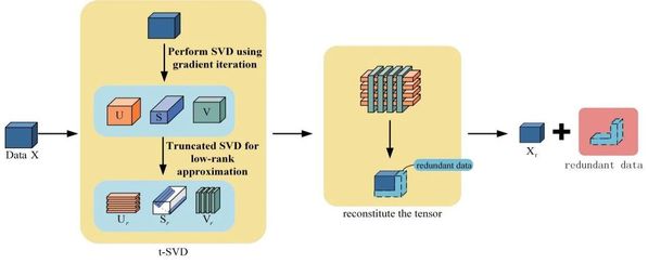 针对上述问题,本研究提出了一种智能降维模型(Smart Dimensionality Reduction Model, SDRM)。该模型的核心在于:利用基于截断奇异值分解(truncated SVD, t-SVD)的低秩张量分解策略对输入的3D图像张量进行动态压缩和降维,显著降低存储需求和计算复杂度;设计了一种名为“AdaMatrix”的新型梯度迭代优化算法,该算法结合自适应矩估计(Adam)和Nesterov加速梯度(NAG),并引入动态调整的逐元素权重矩阵和自适应学习率,高效实现t-SVD分解,加速了收敛过程;构建了t-SVD与梯度下降的协同优化框架,并与分布式多头注意力机制结合,在保证数据精度的同时,显著提升了边缘设备的并行处理能力。